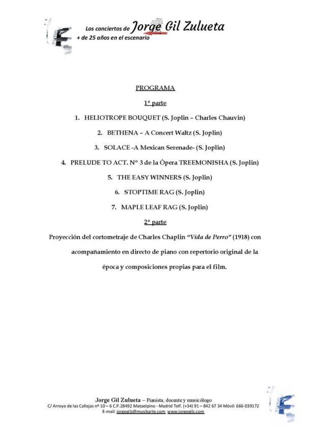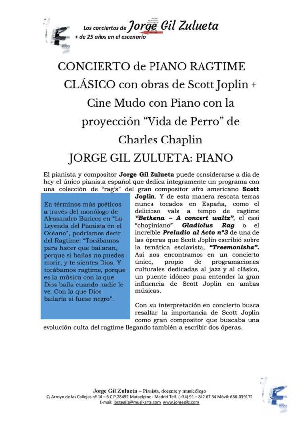 Ragtime clásico Scott Joplin buscando revalorizar la tarea compositiva de este gran autor y sus influencias, tanto en el jazz y como en el llamado “spanish tinge”, el matiz español.